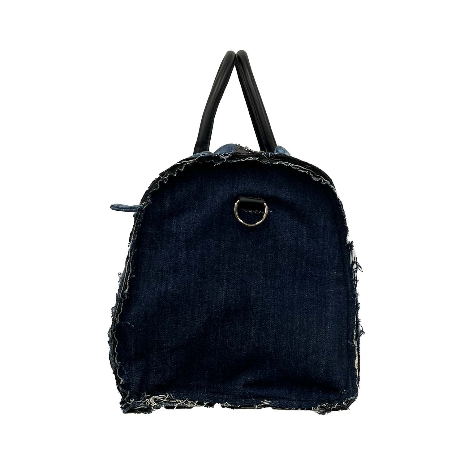 Part art piece, part carryall — this reworked denim duffle from the Selvations x MDR collection takes the familiar and flips it. Built from layered denim panels, it mimics the front of a button-down shirt, complete with a collar, button placket, and a stitched MDR x Selvations tag. The raw frayed edges and tonal denim patchwork embrace a deconstructed aesthetic, while structured black handles bring balance and function. Smart, subversive, and undeniably wearable — this is denim storytelling in bag form.