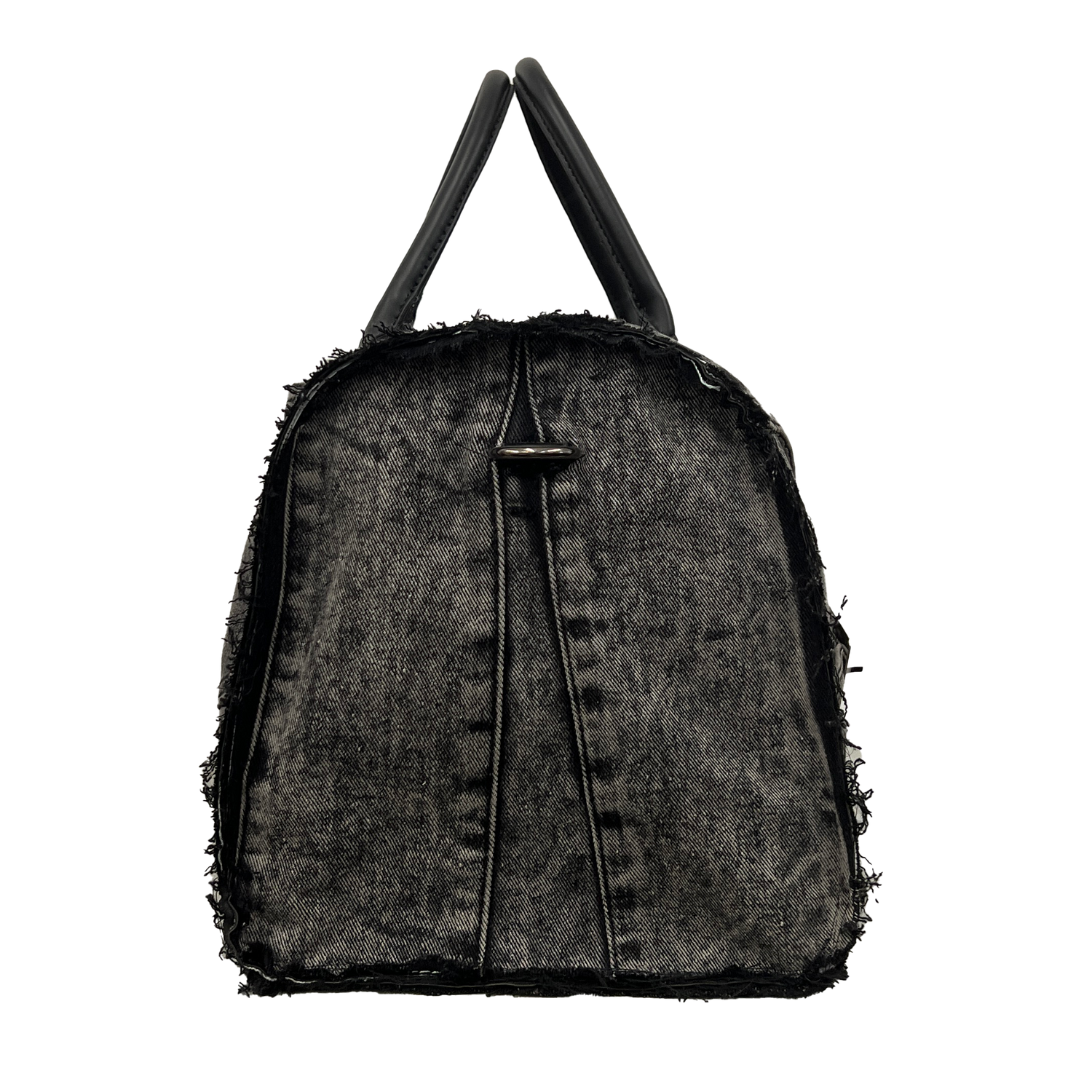 The edgy duffle from the Selvations x MDR collection is crafted from reworked black-washed denim and detailed with bold, criss-crossed belt accents on the front. Featuring original jean elements like pockets and seams, it’s finished with sturdy black handles, raw frayed edges, and a spacious interior that balances statement design with practical function.